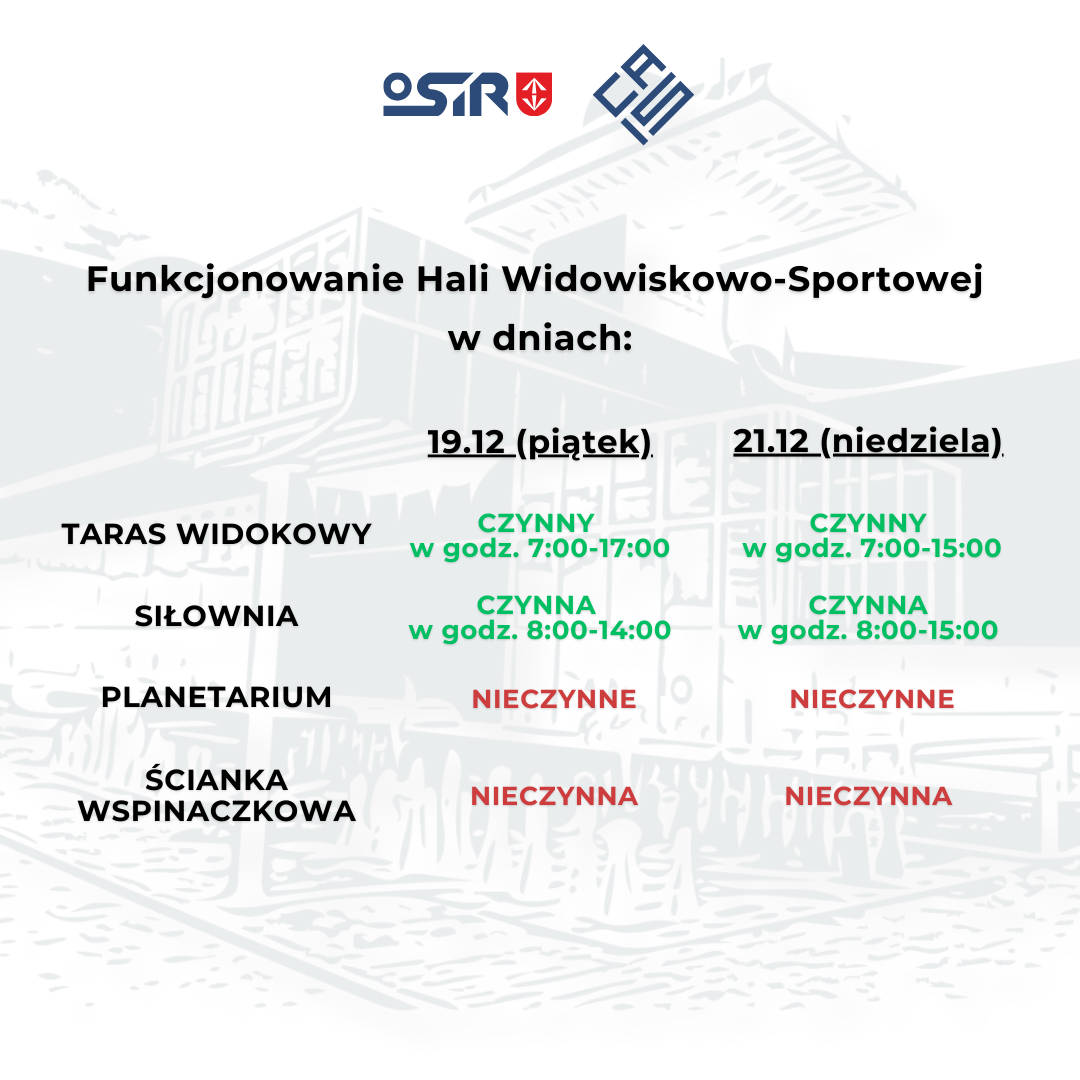 Funkcjonowanie Hali Widowiskowo-Sportowej w dniach 19.12.2025 r. i 21.12.2025 r.