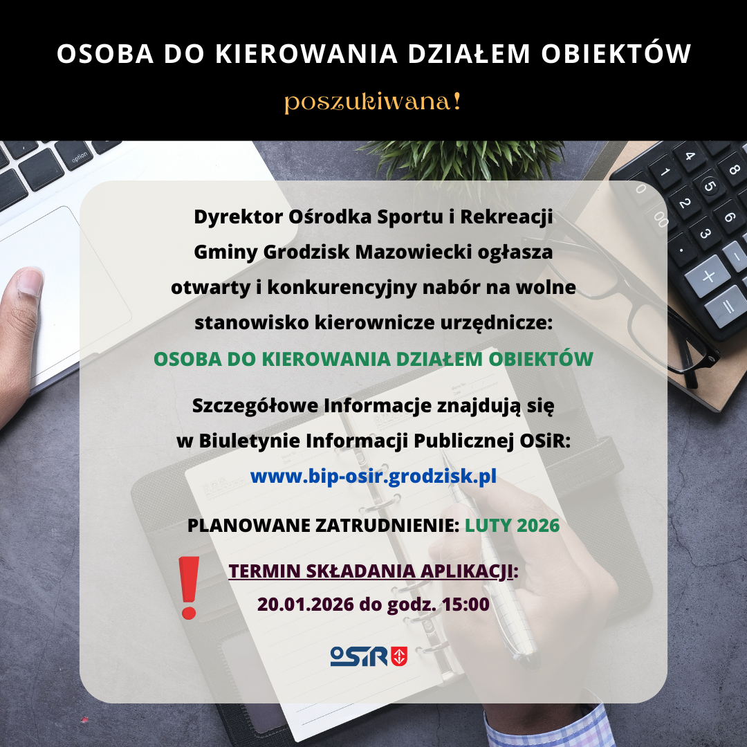 Dyrektor Ośrodka Sportu i Rekreacji Gminy Grodzisk Mazowiecki ogłasza wolny i konkurencyjny nabór na wolne stanowisko kierownicze urzędnicze: osoba do kierowania Działem Obiektów.